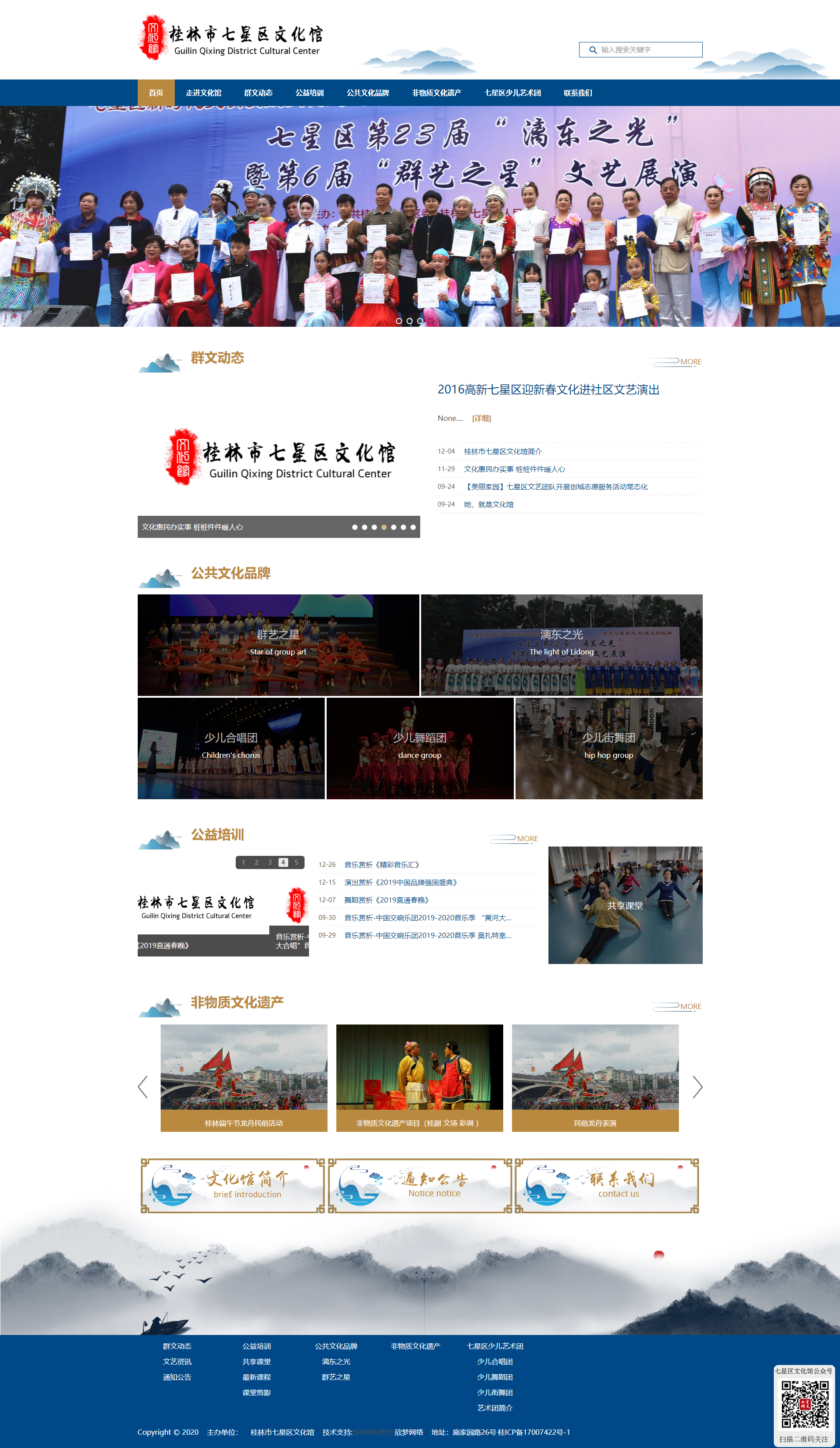 七星区文化馆位于施家园路26号,居于桂林国家高新七星区的文化聚集的中心区域,背靠漓江支流小东江,东靠桂林国际会展中心,近邻桂海碑林博物馆和七星景区,人文环境得天独厚。文化馆建于2008年,同年底竣工并投入使用,总投资1200万元,建筑面积3500平方米。目前,共有公益性教室25间,分别用于音乐、舞蹈、美术、摄影、戏剧、书法、非物质文化遗产传承等日常教学和艺术活动,同时配有专业的音乐工作室和多功能小型剧场。为推动我区群众文化的繁荣发展,多年来坚持立足于丰富群众文化生活,满足广大市民的文化生活需求,常抓不懈的开展公益性群众文化服务活动。在区委、区政府和文化各级部门的共同帮助下,经过多年的努力,在2011年被文化部评委评为国家“一级文化馆”。
